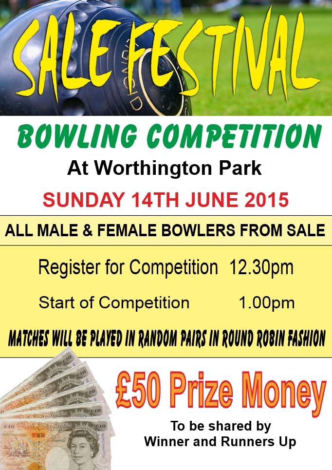As part of Sale Festival 2015, there will be a bowling competition in the Park starting at 12.30pm on Sunday 14th June 2015. Competition open to all Sale bowlers. Maximum of 56 places, so first come, first served.