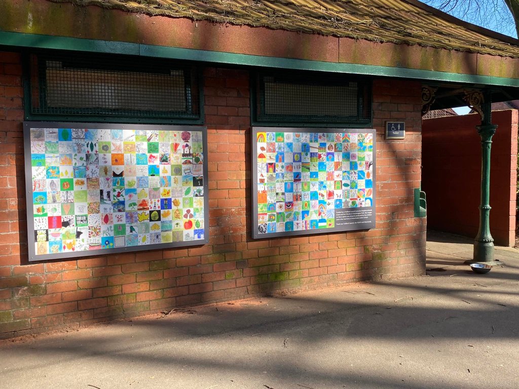 Well it’s taken a while and a lot of hard work and effort by a lot of people to get these art panels up on the side of the toilets in the park. The journey started back in June last year when we asked for bids to create panels for the sides of the toilets. We had several ambitious ideas but in the end we went with the suggestion by a Moorlands teacher to feature artwork by their children. So we put in a bid to Trafford for an inclusive Neighbourhood grant for £600 and we were successful.