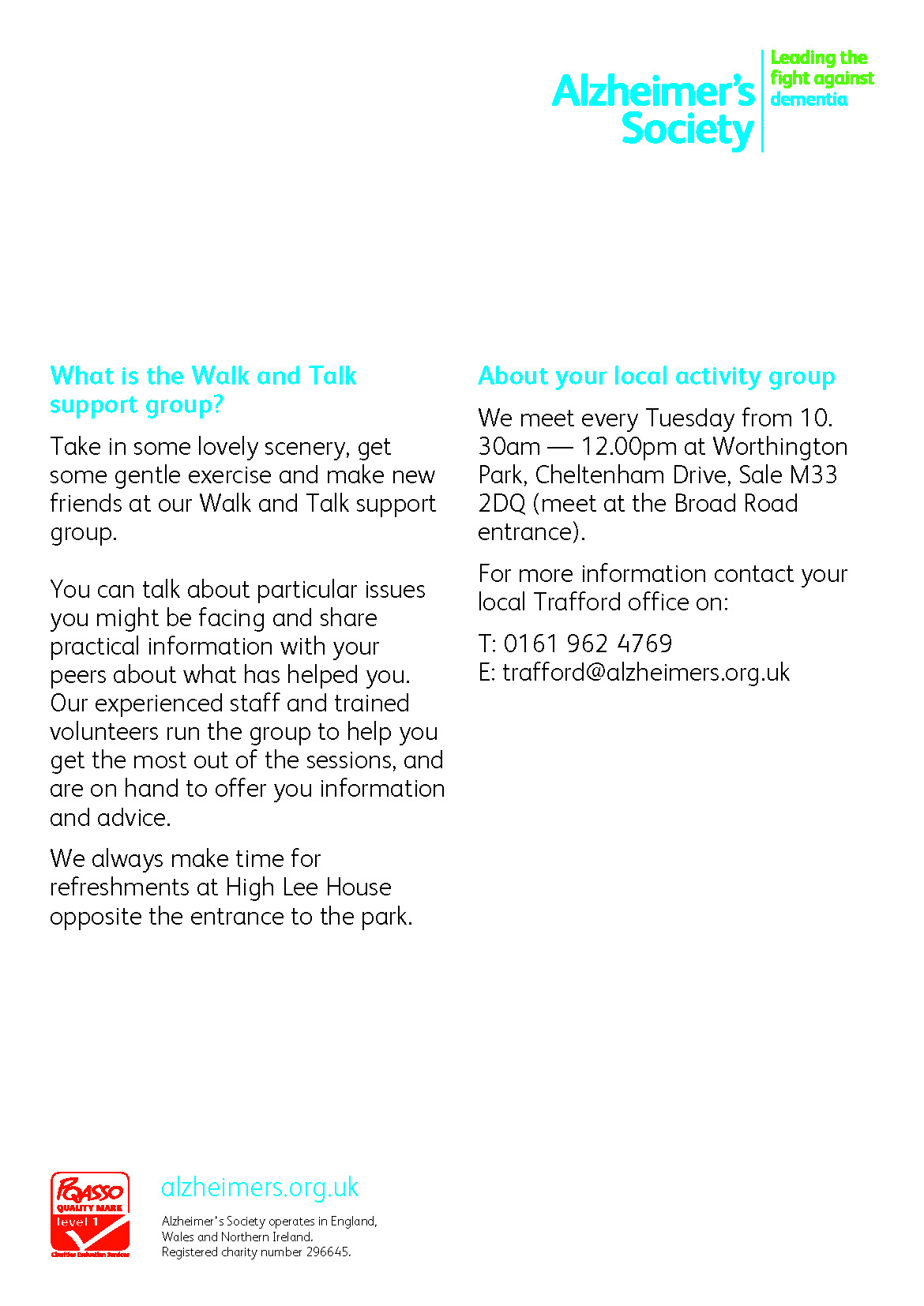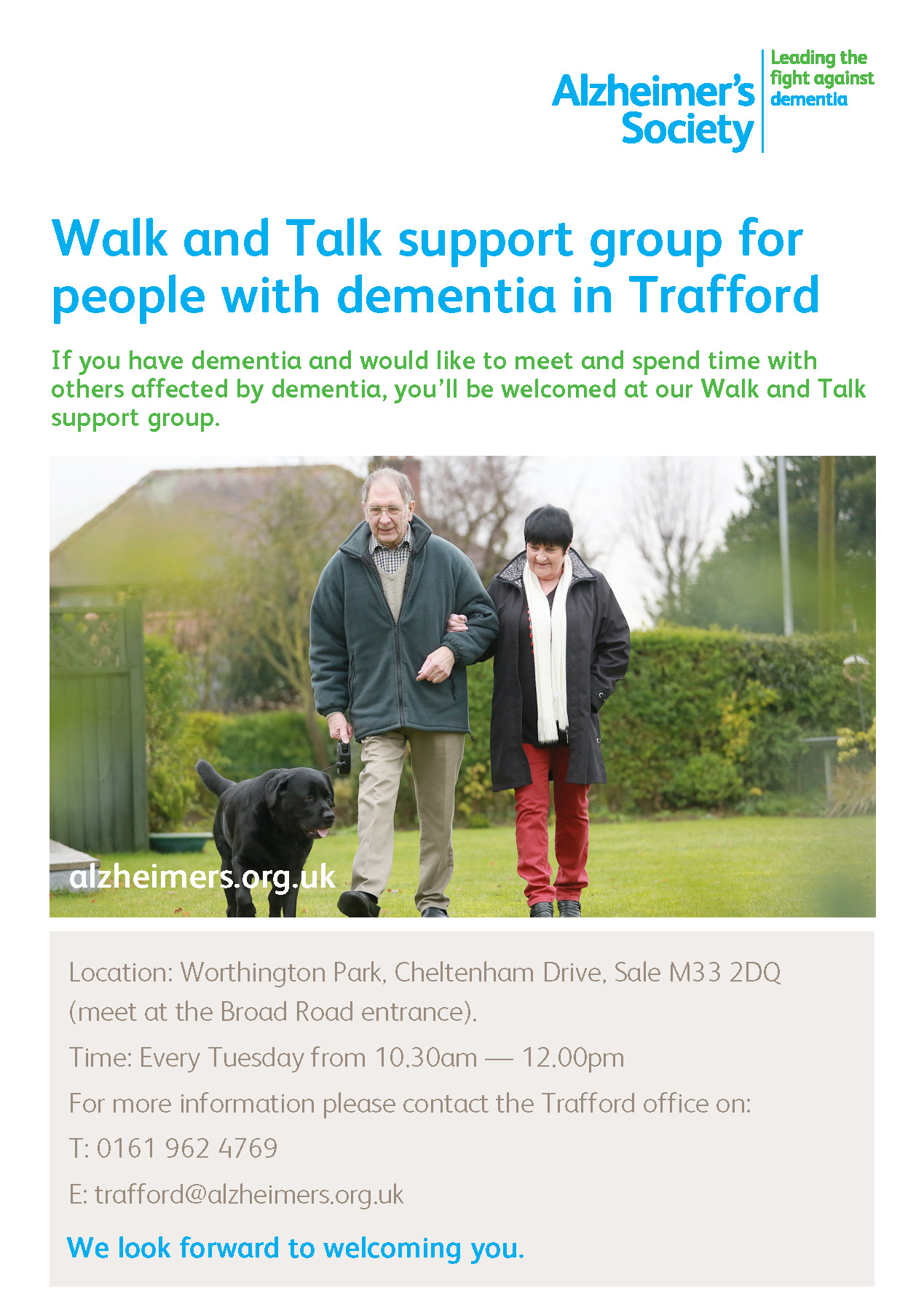 The Alzheimer’s Society are organising regular Walk and Talk support group meetings for people with dementia in Trafford.