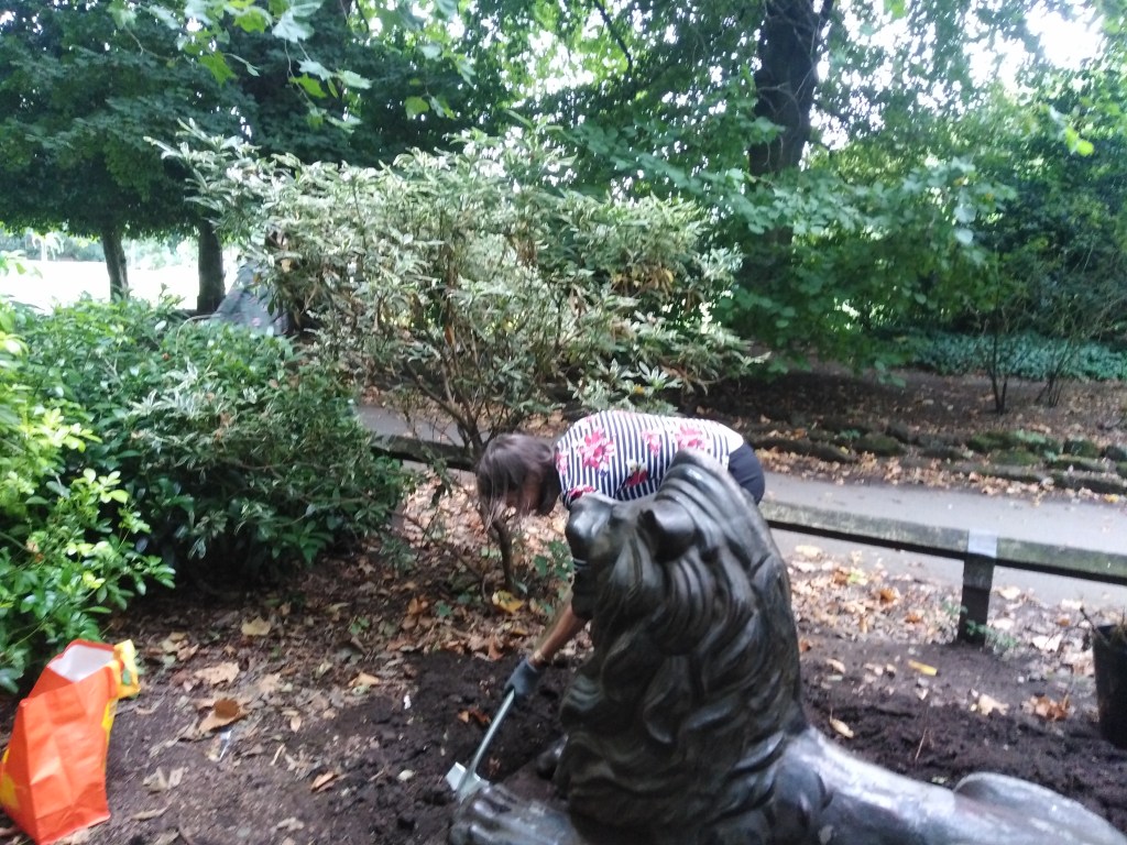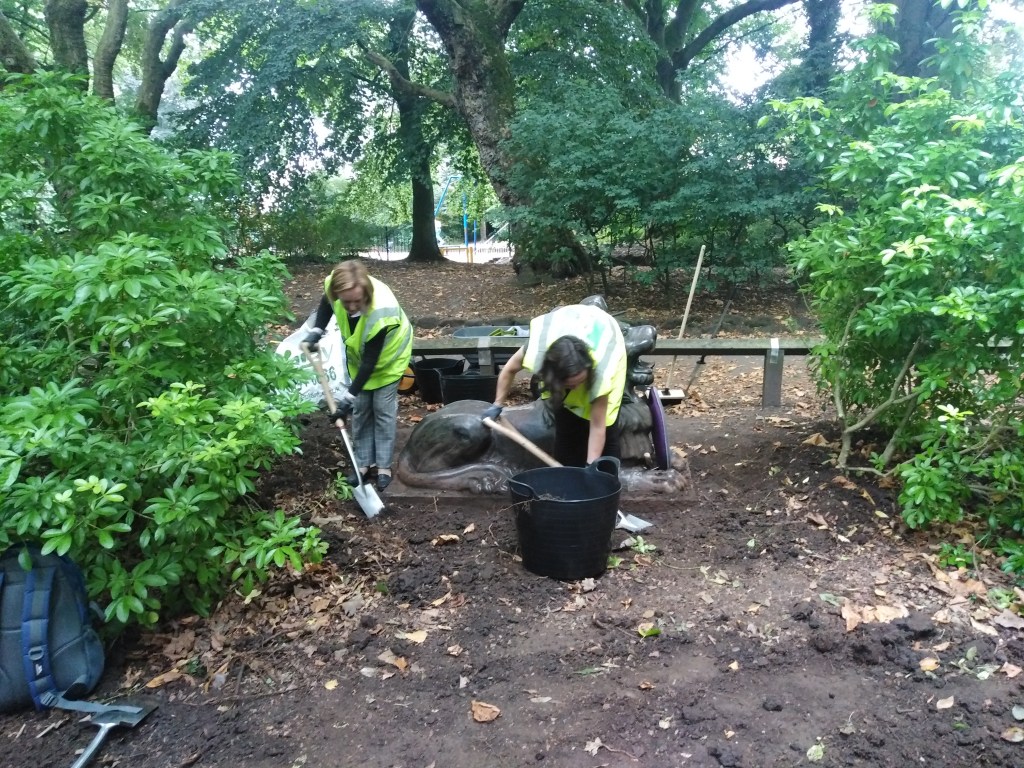The Friends have been busy this weekend beginning to clear soil around the bases of the lions in preparation for some restoration work. Local sculptor and stone carver, Nick Roberson, will be cleaning them, grinding and smoothing the bases, sorting out the paintwork and adding some bronze coloured highlights.