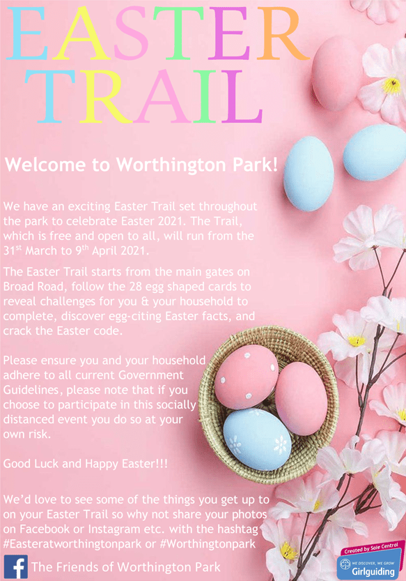 Absolutely delighted to be able to be posting that Sale Central Guiding have organised an Easter Trail in the park. It’s socially distanced and will run from 31st March over the Easter holidays. There’s a trail to follow with lots of Easter facts and some activities. Thank you so much for doing this Sale Guides – we really appreciate this and know it will be enjoyed by many.